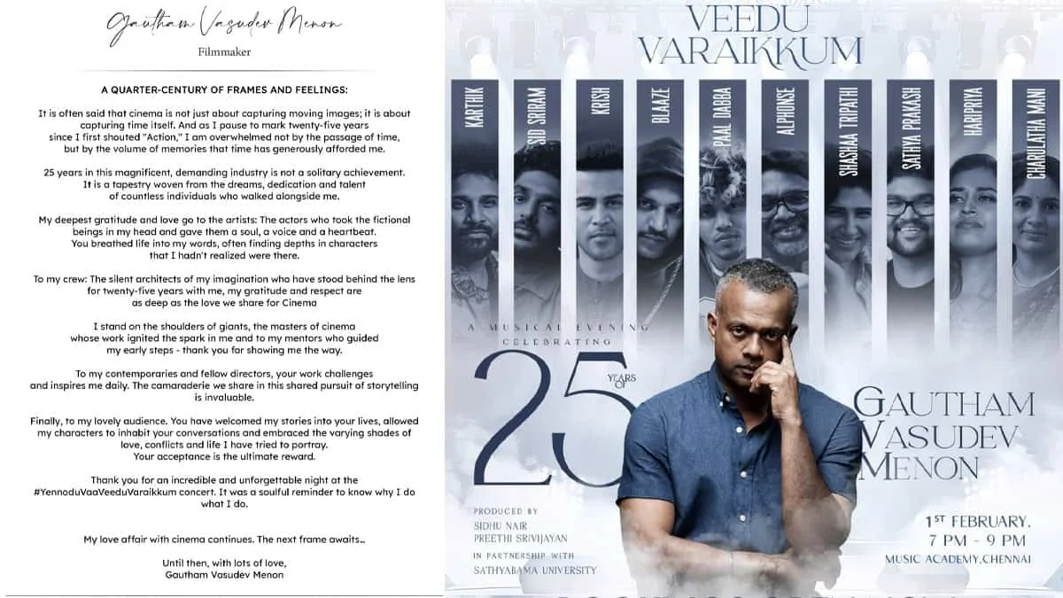 Gautham Menon Completes 25 Years in Cinema: The multiple National Award-winning filmmaker and actor Gautham Menon successfully completed 25 years in the Indian film industry. Recently, he penned an emotional gratitude note to his crews and artists, who walked together alongside him. He also made a special mention for his fans’ acceptance, and their warm appreciation means more than any accolades.
